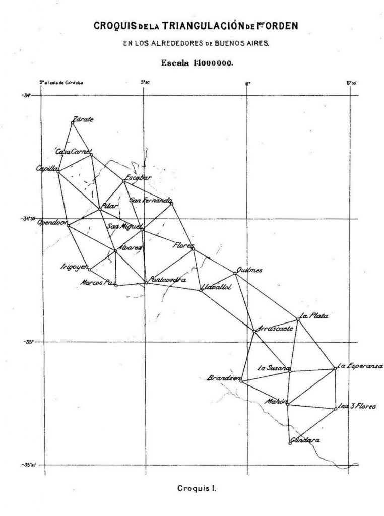 En una edición del Anuario del IGM (1913) se presentan algunos croquis que reflejan los trabajos de triangulación de primer orden de años anteriores a 1912. De esta forma es evidente que ya en 1909 se realizaron trabajos geodésicos en los alrededores de Buenos Aires. Dicha red de triangulación de primer orden abarcó un área extensa, conectando puntos desde Zárate hasta La Plata (Figura 1).