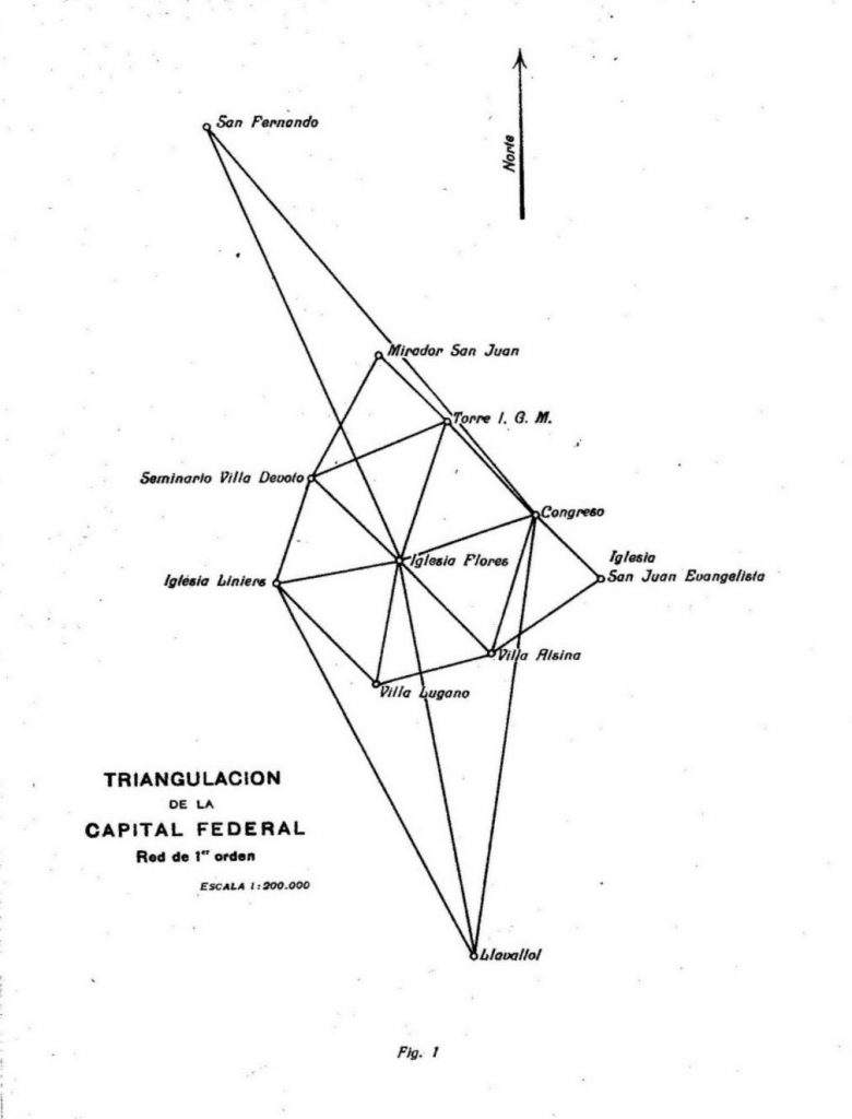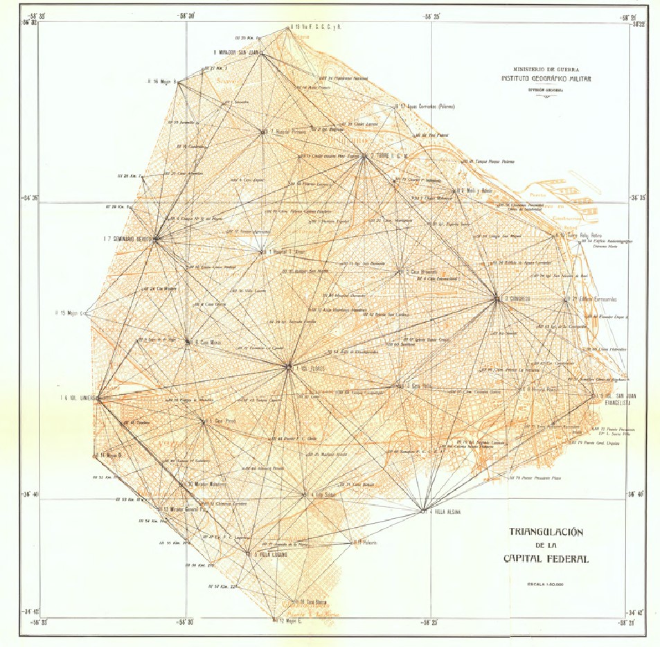 A pesar de que el ambicioso plan original fracasó por falta de recursos y por el estallido de la Primera Guerra Mundial, el IGM continuó desarrollando levantamientos topográficos y geográficos entre 1912 y 1914, consolidando además la institucionalización de su labor con la publicación del Anuario (De Asúa, 2009). Ya entre los años 1916 y 1918 mediante un contrato entre la Municipalidad de la Capital Federal y el IGM, tuvo lugar una triangulación de la Capital Federal exclusivamente, con el objetivo de que sirviera como base del catastro de la ciudad. La red de triángulos fue hecha en 1916 por el geodesta Walterio Vogtherr (De Asúa, 2009) (Figura 2).