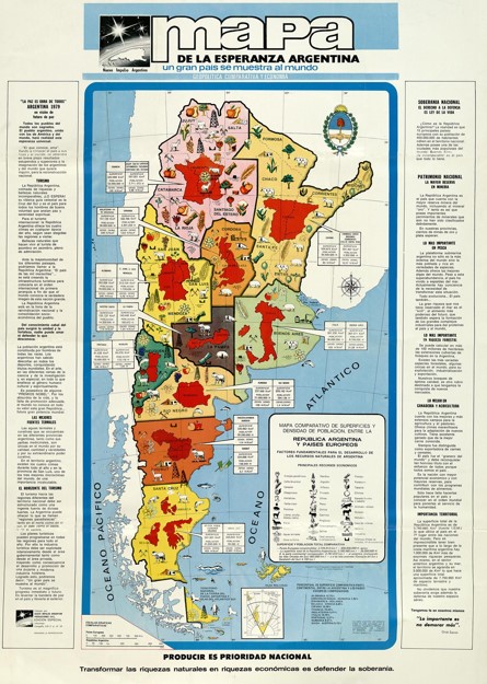 [1] “Mapa de la esperanza argentina: un gran país se muestra al mundo. Geopolítica comparativa y economía, 1979”. Archivo General de la Nación, colección Mapoteca. Código: AR-AGN-MAP01-IV185. Disponible en: https://www.argentina.gob.ar/sites/default/files/16._argentina_1979.pdf