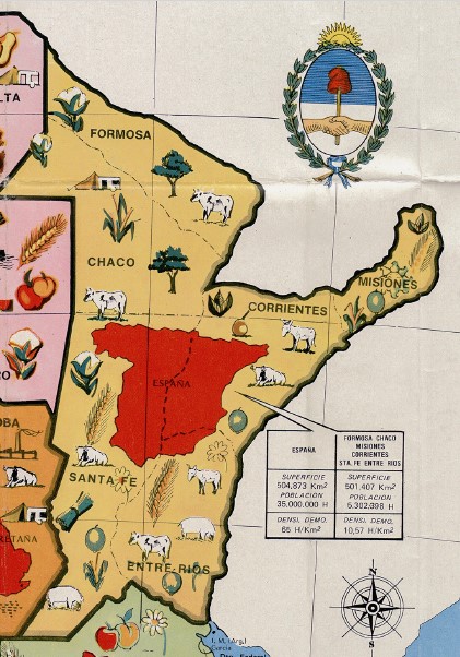 Por otro lado, entre los intersticios que la disposición de los símbolos permite, en cada región, se encuentran representadas las siluetas de los mapas de países europeos acompañados cada uno, por un breve comentario sobre la superficie y la densidad demográfica; con lo que se intentaría demostrar ciertas virtudes o ventajas comparativas de nuestro país respecto de los europeos. Con el objeto de ser comparados sin ningún tipo de sustento más que el de la reproducción de un nacionalismo banal y el intento de cohesión social. Véase también el caso de la comparación entre la superficie del NEA y el territorio de España ubicado en el centro de la región; así como la presencia del escudo nacional, como agregado a este intento de construcción identitaria nacionalista.