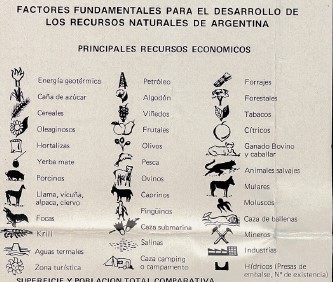 En cuanto a la simbología, se destaca una selección de recursos y productos primarios de índole económica, productiva-extractiva, como representativos de las distintas jurisdicciones y regiones: caña de azúcar, algodón, yerba mate, ganado, recursos energéticos, sitios turísticos y hasta caza de ballenas, entre otros. Elementos diversos, aislados e inconexos, orientados a ser explotados. Nótese la selección de estos recursos en la leyenda “Factores fundamentales para el desarrollo de los recursos naturales de Argentina”. Así, estas imágenes, construyen en sus lectores y el público al que están dirigidas, la idea de elementos y símbolos de carácter objetivo, de representaciones significativas que guardan directa relación con aspectos y “virtudes nacionales”; cuya repetición busca instalar diversidad, y si bien están disgregadas, “su combinación forma un todo único” (Lois, 2015:71).