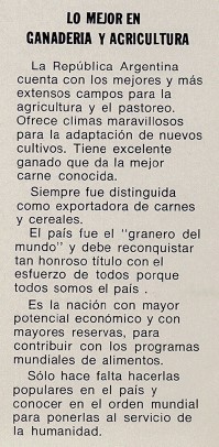 Véanse en esta selección: los recursos forestales y la actividad agropecuaria. En el primer caso, una descripción de los bosques y especies, haciendo hincapié en la calidad de los mismos cuyo objetivo radica en la “conquista de nuevos mercados”. En el segundo, se intenta reinstalar la idea de “Argentina granero del mundo”, se describen las condiciones agroecológicas del territorio y el potencial agrícola y ganadero del país. En este caso, con la intención de “ponerlas al servicio de la humanidad”. Se vuelve, de alguna manera a romantizar nuestra función como garantizadores del fin del hambre en el mundo.
