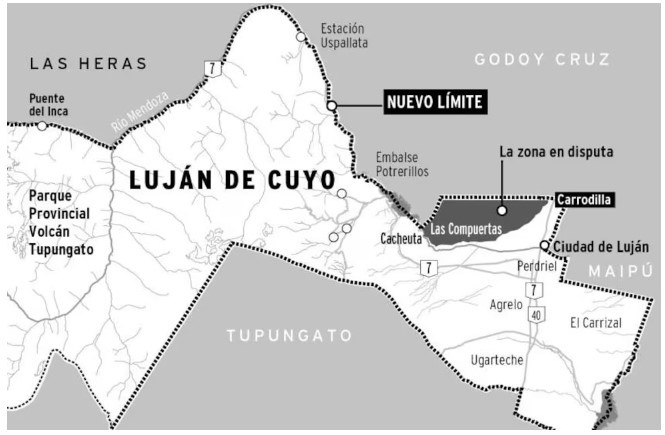 La disputa territorial relacionada con los límites[5] interdepartamentales entre Luján de Cuyo y Las Heras, surgió conforme a la falta de claridad de los mismos. Luján de Cuyo, reclamaba la extensión de su territorio, argumentando que los límites no estaban definidos con claridad y que existía la necesidad de establecer con precisión la delimitación de su jurisdicción. Este conflicto territorial, se enmarca en una problemática de ordenamiento del territorio, en la que confluyeron intereses administrativos, económicos y sociales.
